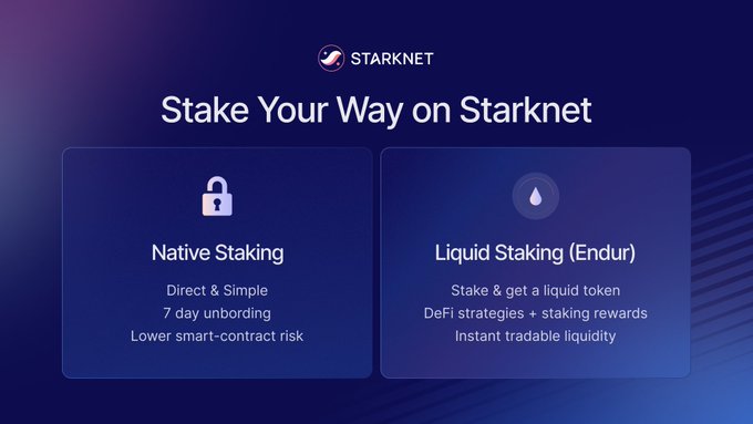 Two ways to stake your BTC & STRK on Starknet: – Native staking: direct, 7-day unbonding – Liquid staking (@endurfi): stake & receive a liquid token for DeFi Simplicity or composability. You choose.